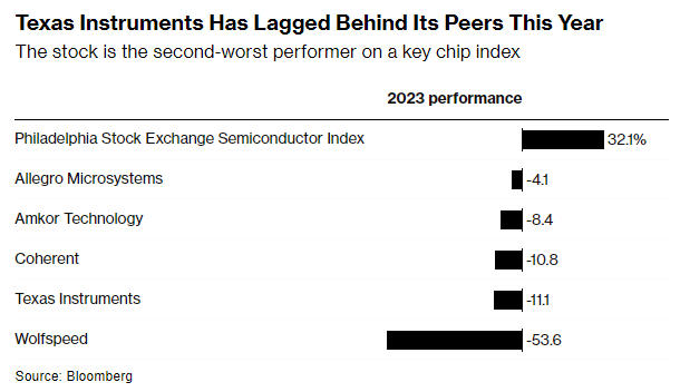 尽管其他芯片制造商的股价已经有所反弹,但德州仪器的股价在今年仍累计下跌11%。这使其成为费城证券交易所半导体指数中表现最差的成分股之一。