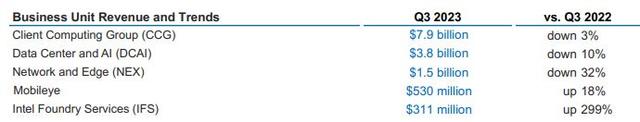 三季度,包含笔记本电脑和台式电脑处理器的英特尔“客户端计算部门”(Client Computing)收入同比下降3%至79亿美元,远好于预期的下降9.2%至74亿美元,市场还预计四季度将复苏至同比增长15.7%。