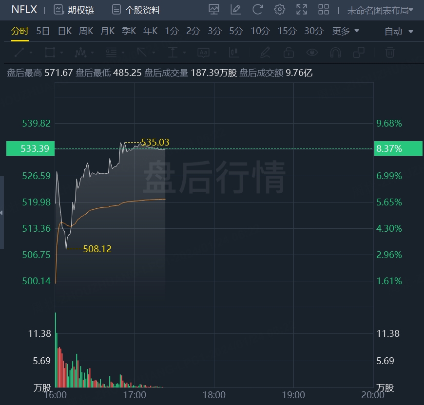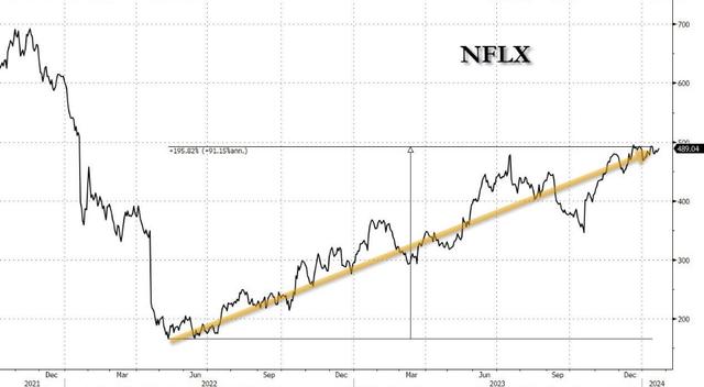 受强劲财报结果推动,奈飞周二美股盘后大涨8.7%,最高达到535美元。过去一年,奈飞已累计上涨了38%,过去两年的涨幅更达到200%。