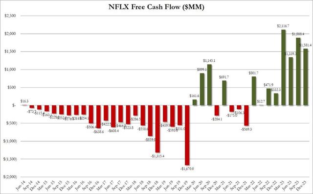 奈飞四季度的自由现金流为16亿美元,这是有记录以来的第三高的季度自由现金流,去年同期只有3.32亿美元。截至2023年全年,经营活动提供的净现金为73亿美元,而2022年为20亿美元,而自由现金流总额为69亿美元,而2022年为16亿美元。其中包括由于好莱坞罢工而延迟支出的约10亿美元。在过去的四年中,Netflix创造了120亿美元的经营活动提供的净现金和超过100亿美元的正现金流。