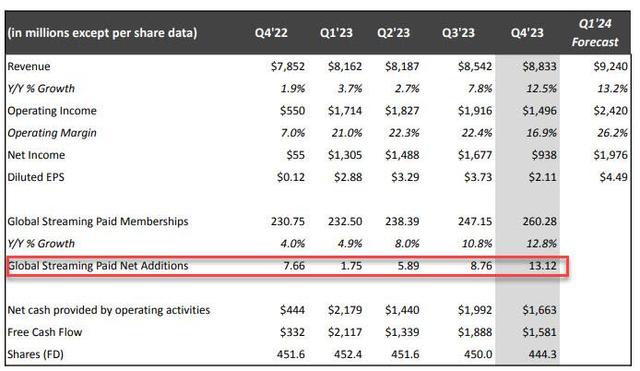 根据财报,受强大的节目阵容的带动,包括皇家戏剧《王冠》(The Crown)的最终季和大卫·芬奇的原创电影《杀手》(The Killer),奈飞的付费订户增长超过了华尔街的预期。该公司第四季度新增了1312万订户,这是其有史以来最大的第四季度订户增长,远远超过了预计的891万的增长,使总订户数增至2.6亿。