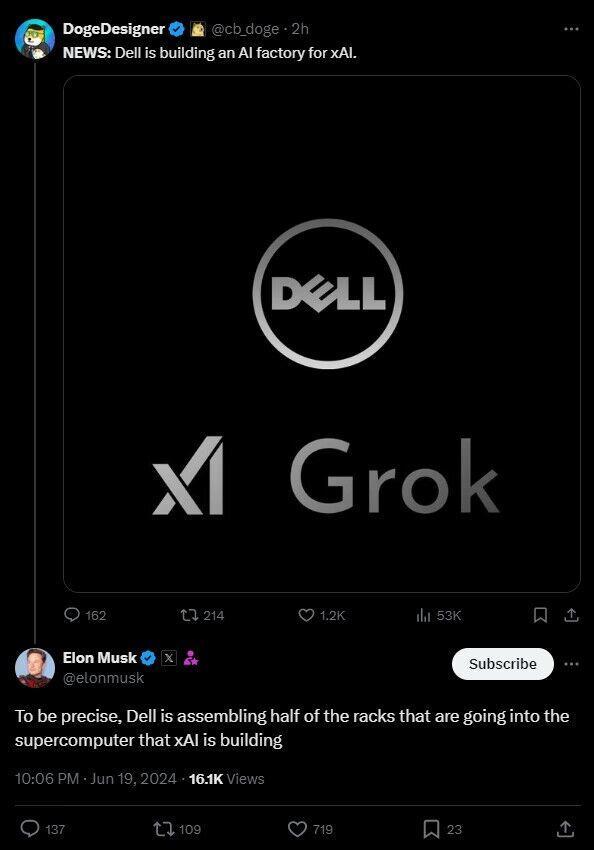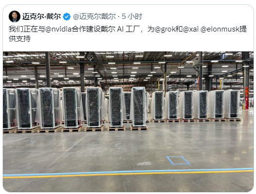 6月19日,戴尔科技CEO Michael Dell在社交媒体X上发帖表示,我们正在与英伟达合作建设戴尔AI工厂,为马斯克旗下xAI公司的大模型Grok提供支持。