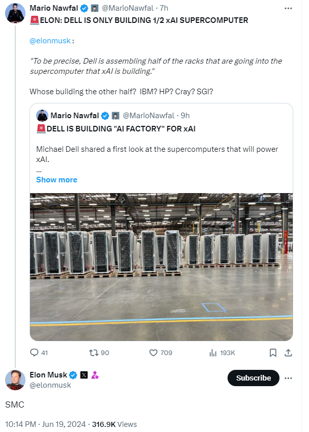 鉴于戴尔正在组装半数的机架,有网友问:“另一半机架谁做?是IBM?惠普?Cray?还是SGI?”时,马斯克回复称“SMC”。据悉,超微电脑(SMCI,也就是马斯克说的SMC)以与英伟达等芯片公司的密切联系及其液冷技术而闻名,该公司也向媒体证实了与xAI的合作关系。