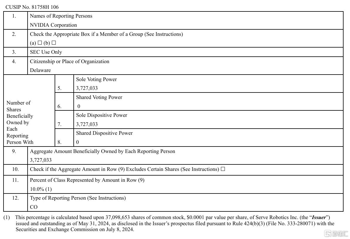 周一,上个交易日暴涨187.07%的Serve Robotics续涨超60%。SEC的文件显示,英伟达将Serve Robotics的可转债,以每股2.42美元的价格转换成了105万股,总投资价值略高于370万美元。在此次增资后,英伟达持有Serve Robotics的股权比例正好升至10%,触发美国证券法的举牌机制。