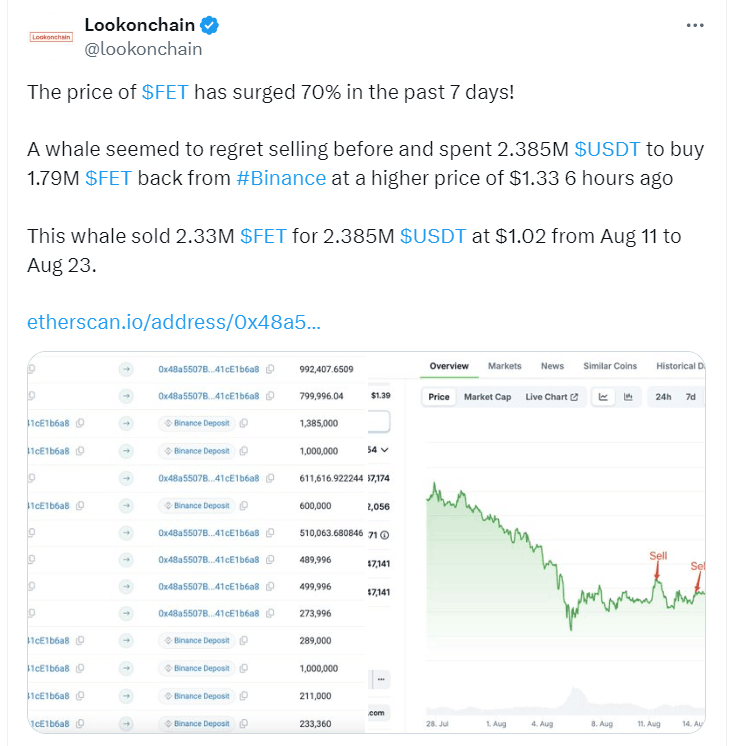 一只鲸鱼似乎后悔以较低的价格出售,在8月25日花费238.5万美元的USDT(Tether)从币安以1.33美元的高价回购了179万枚 FET 代币。