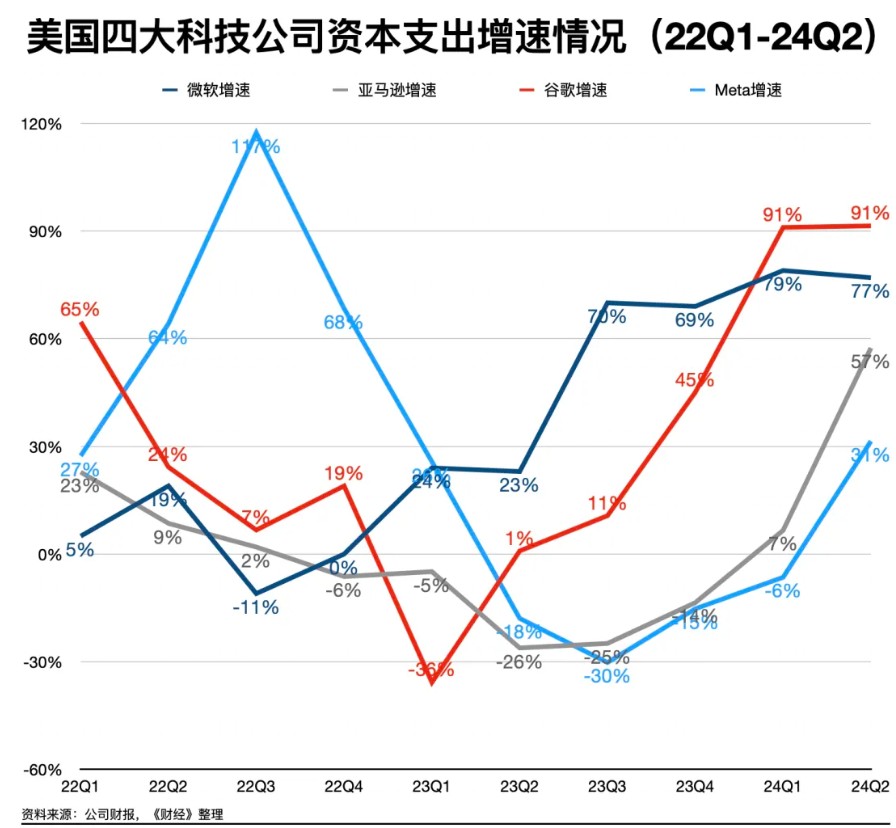 数据显示,2024年二季度,美国四大科技公司微软、亚马逊、谷歌、Meta的资本支出增速达到了惊人的65.9%,为过去至少五年的最高水平。