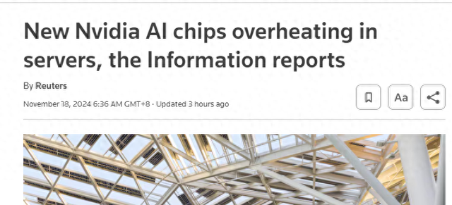 【环球网科技综合报道】11月18日,据路透社援引《信息》报道,英伟达最新发布的Blackwell AI芯片在服务器应用中遭遇了过热问题,引发了一系列关注与担忧。这一状况可能导致部分客户的数据中心部署计划被迫推迟。