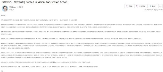 新浪科技讯 11月25日下午消息,在公司成立十周年之际,蔚来创始人李斌发布内部信,向团队提出了“保持初心、专注行动”的新要求。
