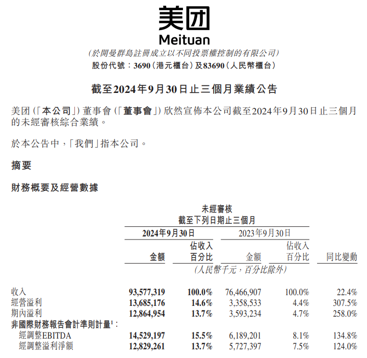 11月29日,美团发布截至9月底的第三季度业绩公告,第三季度营收935.8亿元人民币,同比增长22.4%,预估919.9亿元人民币;第三季度核心本地商业收入693.7亿元人民币,同比增长20.2%,预估683.3亿元人民币,新业务收入242.0亿元人民币,预估233亿元人民币;第三季度净利润128.6亿元人民币,预估94.1亿元人民币,调整后净利润128.3亿元人民币,预估116.6亿元人民币;调整后息税折旧及摊销前利润145.3亿元人民币,预估133.2亿元人民币。