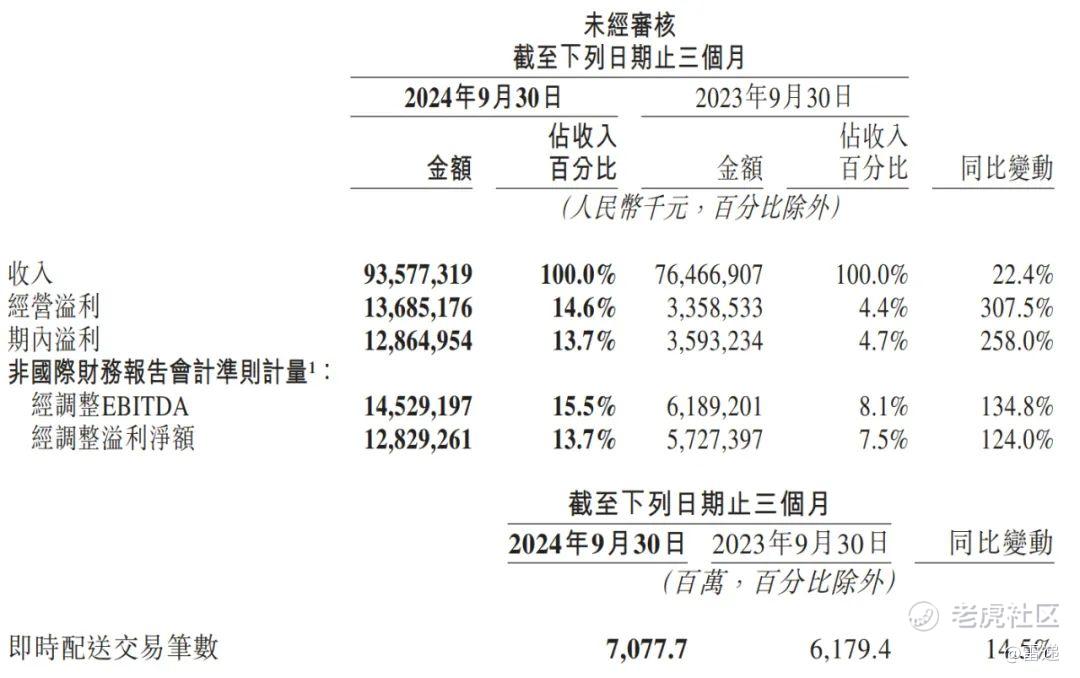 2024年第三季度,美团年交易用户数、年活跃商户数、年交易用户的年均消费频次均持续增长,并突破历史新高。即时配送订单数增至70.78亿笔,较上年同期的61.79亿笔增长14.5%。