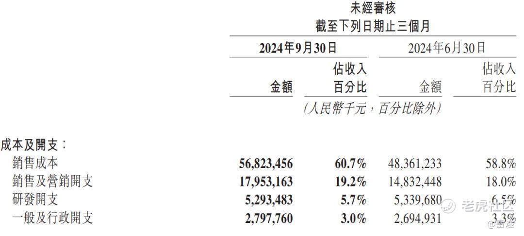 美团2024年第三季度销售成本为568亿元,较上年同期的484亿元增长17.5%;占收入百分比由58.8%增长1.9个百分点至60.7%。金额的增加主要由于实时配送交易笔数及季节性骑手补贴的增加导致配送相关成本增加;及商品零售业务销售成本增加。