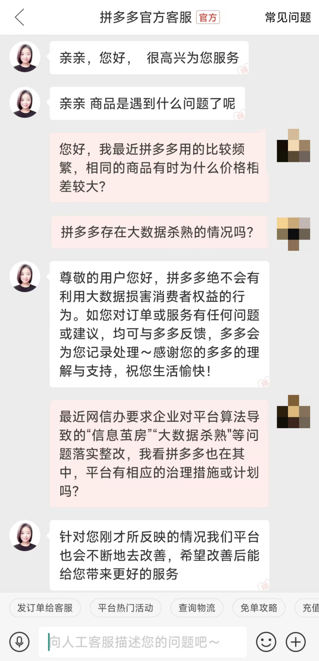 拼多多客服也告诉新识研究所,“拼多多绝不会有利用大数据损害消费者权益的行为,如对订单或服务有任何问题和建议均可反馈,平台会对服务不断进行改善。”