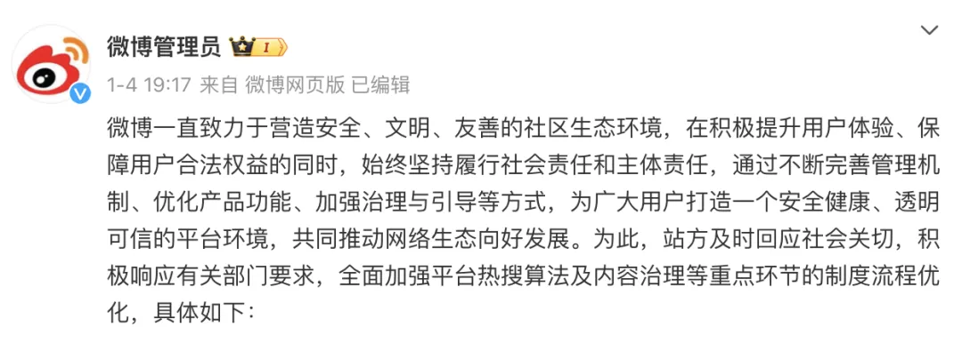 1月4日,微博提出7条具体措施,对全面加强平台热搜算法及内容治理等重点环节的制度流程优化。
