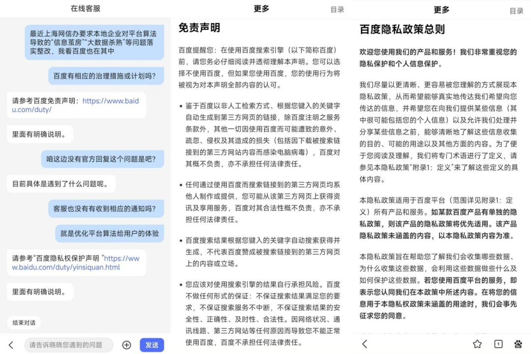 部分平台未明确算法治理举措:百度让看声明,滴滴否认杀熟