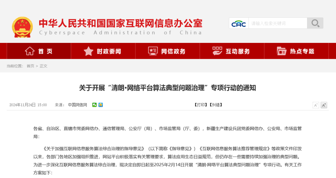 2024年11月24日,国家网信办发布《关于“清朗·网络平台算法典型问题治理”专项行动的通知》,提出重点整治同质化推送营造“信息茧房”、违规操纵干预榜单炒作热点、盲目追求利益侵害新就业形态劳动者权益、利用算法实施大数据“杀熟”、算法向上向善服务缺失侵害用户合法权益等重点问题。该专项行动将进行到今年2月14日。