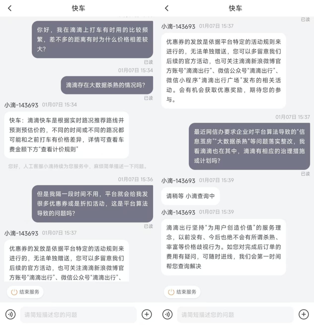 对网友反映的大数据杀熟行为,滴滴快车客服称,“滴滴以前没有、今后也绝不会有所谓杀熟、宰富等价格歧视行为。打车价格差异是根据实时路况预估的,优惠券的发放则是根据平台活动进行的。”