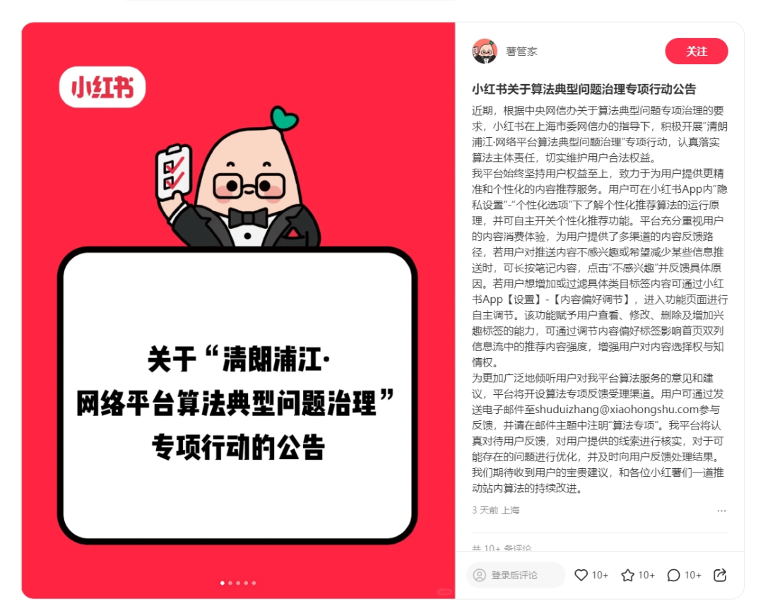 拼多多、小红书、携程、哔哩哔哩、得物、喜马拉雅、饿了么、大众点评、叮咚买菜等网站平台陆续发布了“清朗浦江·网络平台算法典型问题治理”专项行动治理公告。