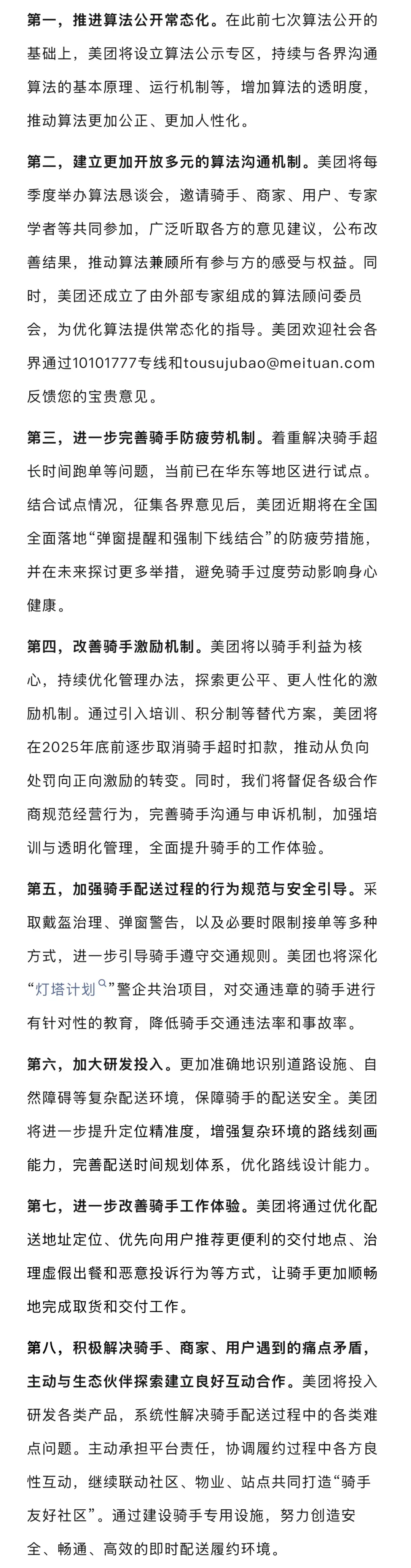 在此背景下,12月27日, 美团宣布将采取八项举措推进算法导向正确。包括推进算法机制公开多元,进一步完善骑手防疲劳和激励机制,优化骑手配送环境和安全问题。