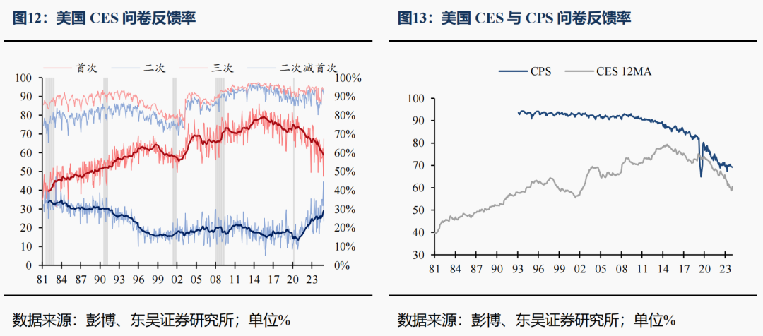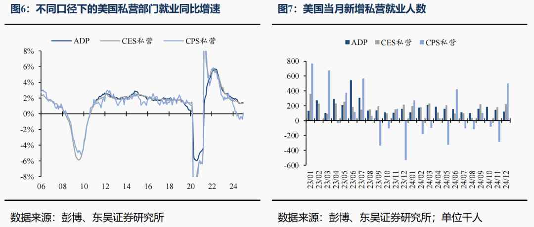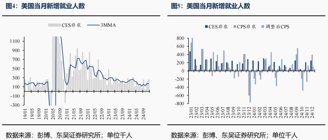 非农私营口径下,ADP、CES、CPS分别新增就业+12.2、+22.3、+50万,并未出现以往就业报告中“此消彼长”的情况(例如非农增长、但CPS就业大减)。②居民就业和失业结构改善。从就业结构上看,12月新增的47.8万居民就业中,私营非农的全职、兼职就业分别新增8.7、24.7万,这也导致全职就业同比增速自2024年2月转负以来首次转正,12月最新录得+0.33%。从失业结构上看,12月减少的23.5万失业者中,有16.4万来自永久失业(失业27周以上),是本月失业减少的最大贡献,永久失业者占比也由26.27%回落至24.79%。③数据质量继续改善。12月CES问卷首次反馈率为68.4%,前次为67.4%,较此前50-60%的反馈率有明显改善。同时,本月公布的前两个月合集修正幅度为-0.8万,修正幅度较小,与数据质量的改善交叉印证。