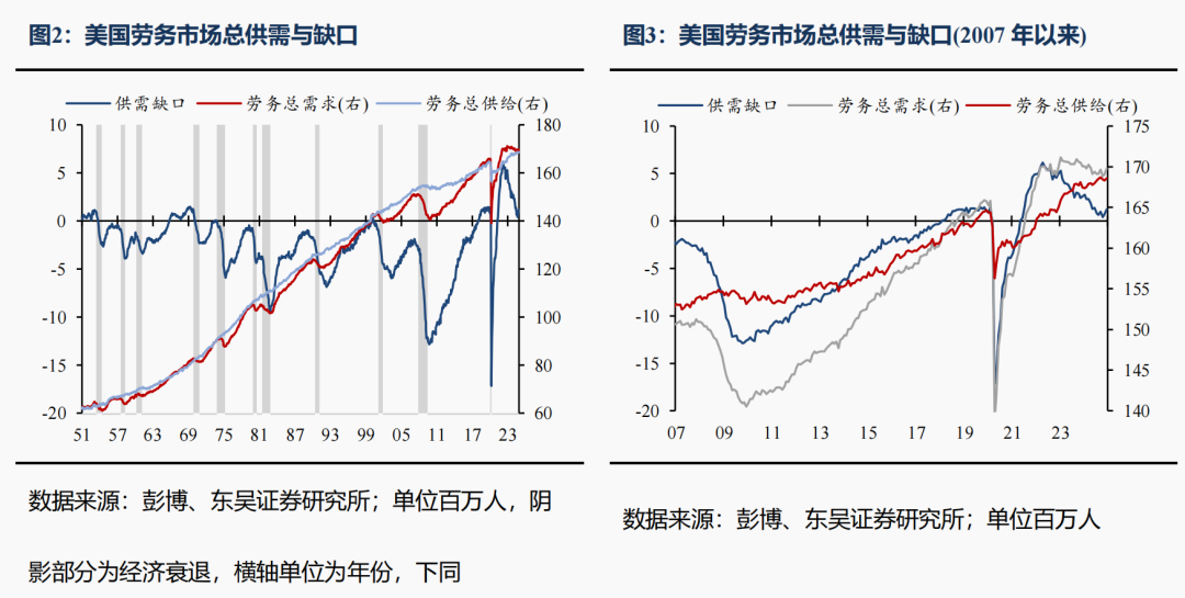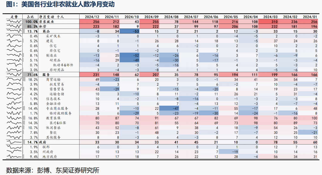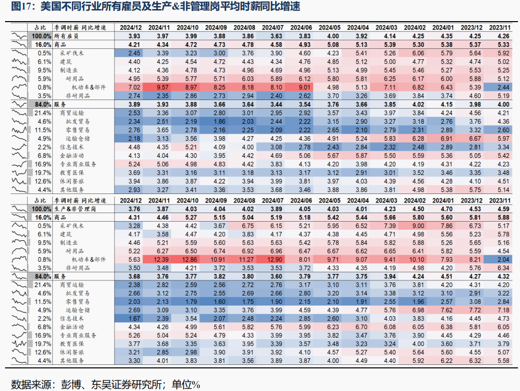 当然,12月就业数据仍有少许薄弱环节:①制造业就业显著走弱,服务业仍是主力。教育医保、休闲餐旅、商贸运输分别新增就业8、4.3、4.9万人,仍是12月就业增长的主力,而制造业就业环比-1.3万,其中耐用品制造业-1.6万,是主要拖累,在上月机动车罢工结束后,制造业就业延续弱势。②就业扩散指数环比回落。1年期非农就业扩散指数本次录得59,较前值62回落;1个月、3个月扩散指数亦出现不同程度下行,表明就业减少的行业数量仍多于就业增长的行业;③供需缺口抬升的同时时薪增速回落。12月劳务总需求增加73.7万,总供给增加24.3万,共同带动供需缺口由71.8万再度回升至121.2万。供需均衡下,12月时薪环比+0.28%,预期+0.3%,前值+0.37%;同比+3.93%,预期+4.0%,前值+3.97%;生产&非管理岗时薪环比+0.2%,前值+0.3%;同比+3.76%,前值+3.87%。供需缺口走阔很大程度受职位空缺走高影响,其持续性有待观察;时薪增速走弱在结构上主要受机动车、IT行业拖累,且市场(尤其是美股)并未交易时薪增速的走弱。