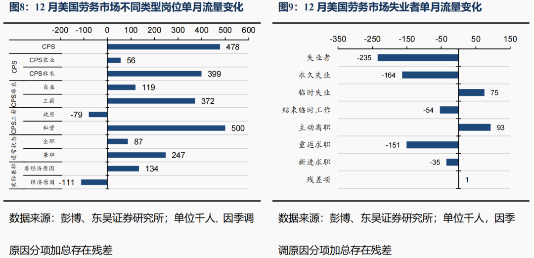 12月非农就业:不光是表观数据大超预期,细看就业结构也无懈可击。美国12月新增非农就业+25.6万,预期+16.5万,前值由+22.7万下修至+21.2万,前两个月新增非农合计下修0.8万人。同时,失业率从4.2%回落至4.1%。12月非农的强劲不仅体现在表观的新增非农与失业率上,数据结构也没有明显瑕疵:①不同口径下新增就业均明显增长。12月CES问卷企业端新增非农就业+25.6万,CPS问卷居民端增加就业+47.8万,与CES统一口径的调整后CPS新增就业+10.2万;