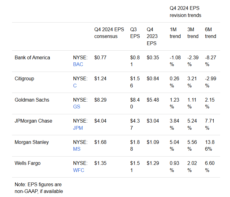 分析师们预计第四季度业绩不会创下新高,预计季度环比将出现下滑。但是在过去六个月里,大多数货币中心/金融中心类型银行的共识预期有所改善。例如,摩根大通第四季度的每股收益共识预期为4.04美元,在过去一个月内上调了3.8%,在过去六个月内上调了7.7%。分析师们对摩根士丹利第四季度每股收益的乐观情绪大幅增强,主要预期美股11月-12月因特朗普胜选而大涨带来交易业务增长,以及投行业务受益于全球股市IPO复苏,在过去一个月内分析师们将共识预期上调了5.0%,在过去六个月内上调了近14%。