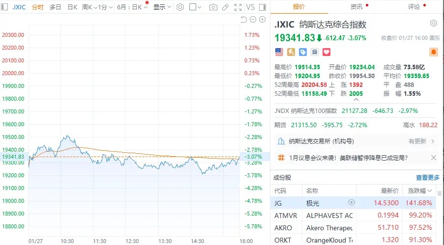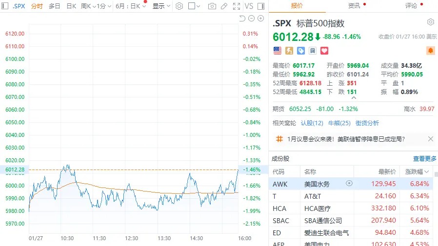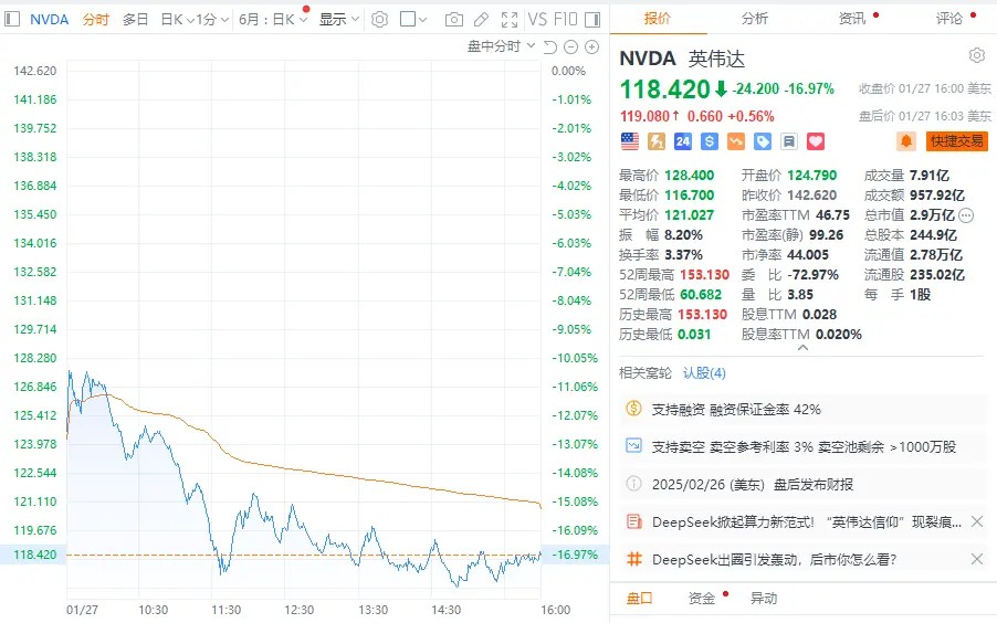 当地时间1月27日,美股三大指数收盘涨跌不一,道指涨0.65%,标普500指数跌1.46%,纳指跌3.07%。费城半导体指数大跌超9%。英伟达跌约17%,单日市值蒸发5890亿美元,创历史上最大单日个股蒸发规模。谷歌跌超4%,特斯拉、微软、英特尔跌超2%,奈飞小幅下跌;苹果涨超3%,再度成为全球市值最高上市公司;Meta涨超1%,亚马逊小幅上涨。Vistra跌超28%,Constellation Energy跌近21%。
