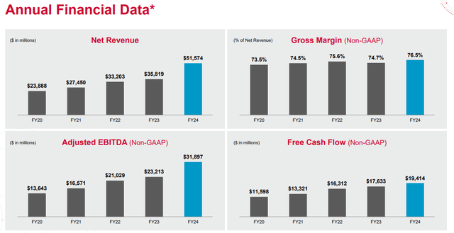 与此同时,博通的财务业绩为其投资价值增添了有力支撑。2024 财年,公司总收入同比增长 44%,达到创纪录的 516 亿美元。尽管 VMware 的集成贡献巨大,但公司(不包括 VMware)仍实现了近 9% 的增长。