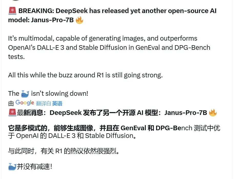 当地时间1月27日, DeepSeek团队正式发布两款多模态框架——Janus-Pro 和 JanusFlow。其中,Janus-Pro是一款统一多模态理解与生成的创新框架,通过解耦视觉编码的方式,极大提升了模型在不同任务中的适配性与性能。