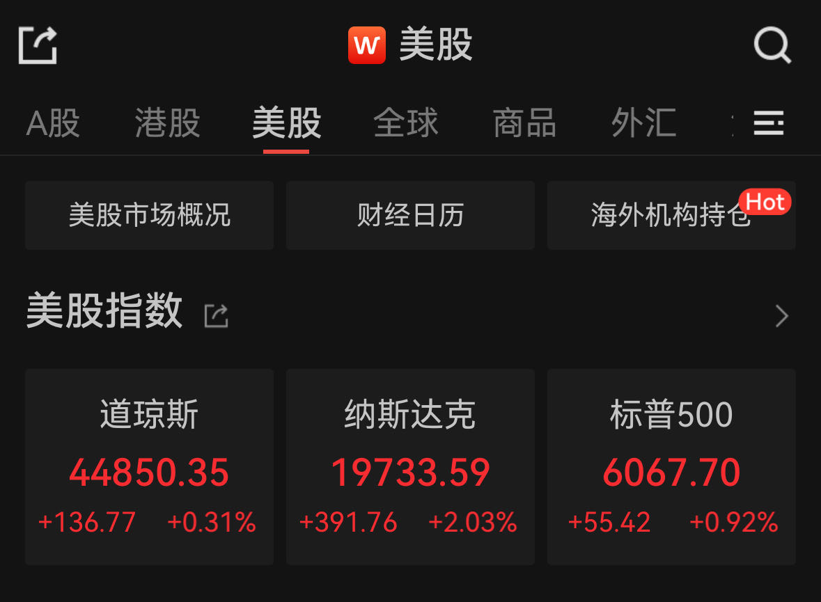Wind截图截至收盘,道指涨0.31%报44850.35点,标普500指数涨0.92%报6067.7点,纳指涨2.03%报19733.59点。