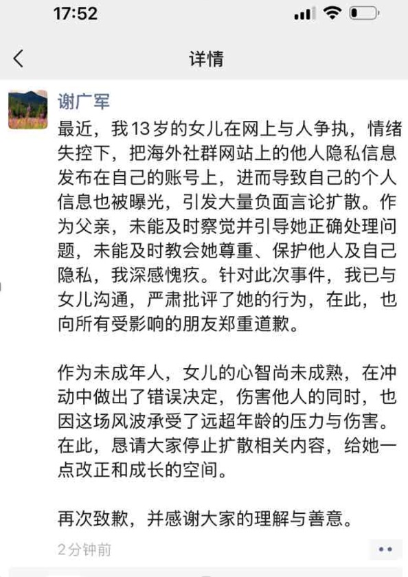3月17日,百度副总裁谢广军发布微信朋友圈表示深感愧疚,并向所有受影响的朋友郑重道歉。谢广军表示:“我13岁的女儿在网上与人争执,情绪失控,把海外社群网站上的他人隐私信息发布在自己的账号上,进而导致自己的个人信息也被曝光,引发大量负面言论扩散。作为父亲,未能及时察觉并引导她正确处理问题,未能及时教会她尊重、保护他人及自己隐私,深感愧疚,向所有受影响的朋友郑重道歉。”