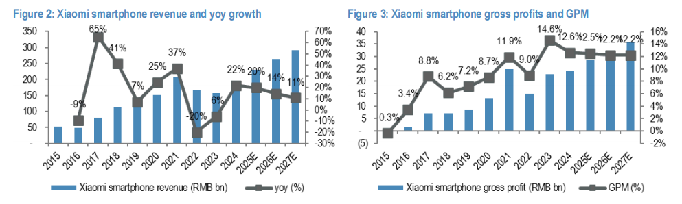 小米继续在高端智能手机领域获得份额,IoT业务保持健康增长,受益于消费补贴和向高毛利品类如白色家电的扩张。摩根大通预计2025年智能手机收入增长20%,但到2026年可能放缓,因为2025年消费补贴的影响将减弱。互联网服务收入增长仍然缓慢,核心收益预计在未来2-3年内保持中等增速。