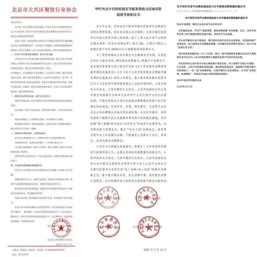 近期,江西、陕西、北京、辽宁、山东等五个省市,19家餐饮行业协会纷纷发布公开信,呼吁美团等外卖平台降低佣金。大连市美食文化协会在倡议书提到:经各协会联合走访调研,大部分餐饮经营单位均表示,现有市场上如美团、饿了么等主流外卖平台的综合服务费率(包含外卖佣金等)接近20%,已使约70%以上的餐饮商户和近90%的社区小微餐馆面临经营压力。而山东滨州市饭店烹饪餐饮协会则在倡议书中表示,餐饮协会一直不断接到各类餐饮企业关于美团等外卖平台20%-26%的佣金费率大幅度挤压商户利润空间的反馈。不过,上述倡议书随后均被删除。