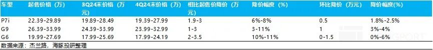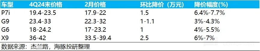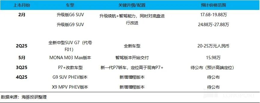 3)但主要问题出在 2025 年一季度指引上:2025 年一季度销量指引 9.1-9.3 万辆,隐含 3 月销量 3 万-3.2 万辆,基本环比 2 月份持平 - 仅增加 2000 辆左右,这个指引在改款 G6&G9 上市情况下,比较平淡,让市场开始担心爆款车型 P7+ 和 M03 的销售势头是否能继续维持。