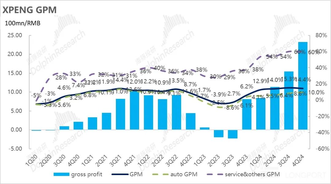 2025 年一季度,小鹏为了迎接 3 月的改款 G6 和 G9,对老款车型继续降价,平均降幅达到 4%-5%,也带动了卖车单价的继续下滑,所以市场同样也担心在这样的单价预期下的汽车毛利率是否会环比下滑,但一季度小鹏仍然给了汽车毛利率能站上双位数的预期,背后仍然还是降本能力的大幅改进。