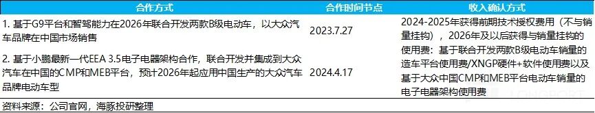 小鹏与大众的合作从 2023 年 7 月开始,先基于 G9 平台和小鹏智驾能力在 2026 年联合开发两款 B 级电动车,但在 2024 年 4 月扩展到基于小鹏最新一代 EEA 3.5 电子电器架构展开合作,联合开发并集成到大众在中国的 CMP 和 MEB 平台。
