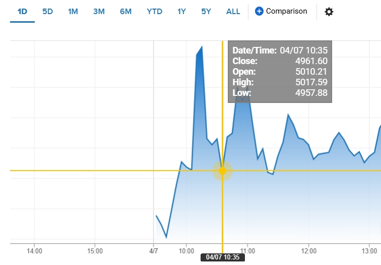 美国股指随即飙升。标普500指数早盘一度下跌4.7%,随后上涨3.4%,盘中走势出现惊人逆转。道琼斯市场数据显示,从上午10:08到10:18的10分钟内,该指数的市值增加了2.4万亿美元。