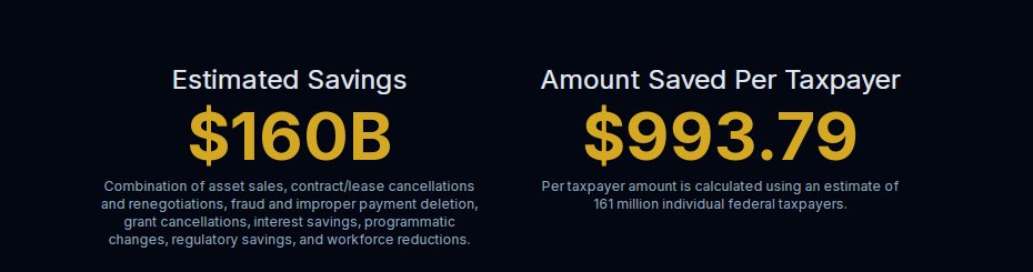 据DOGE网站统计,截至当地时间4月29日,其通过裁员、终止合同、取消资助等举措,已为美国纳税人节省了1600亿美元。