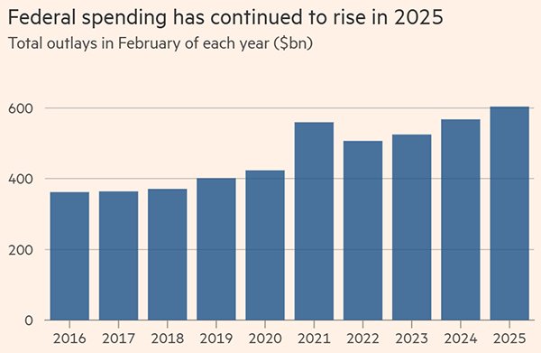 2016年至2025年,每年2月美国财政开支变化趋势图,单位为十亿。从图中可以看出,DOGE的改革效果并不明显。 《金融时报》制图