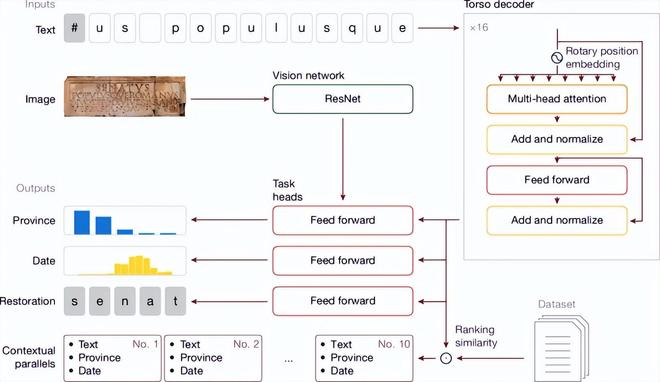 基于这个庞大的数据集,Aeneas 采用了一种基于 Transformer 架构的深度神经网络。它不仅仅是分析铭文的文本内容,还能在某些情况下结合铭文的图片进行多模态分析(multimodal analysis)。当研究人员输入一段残缺的铭文文本(甚至可以标记出缺失文本的长度是已知的还是未知的)和图片时,Aeneas 会通过嵌入(embedding)将每一段铭文转换成一个独特的“历史指纹”。这个指纹不仅编码了文本的字面信息,还包含了其背后隐藏的语言模式、句法结构、历史背景和地理来源等深层信息。