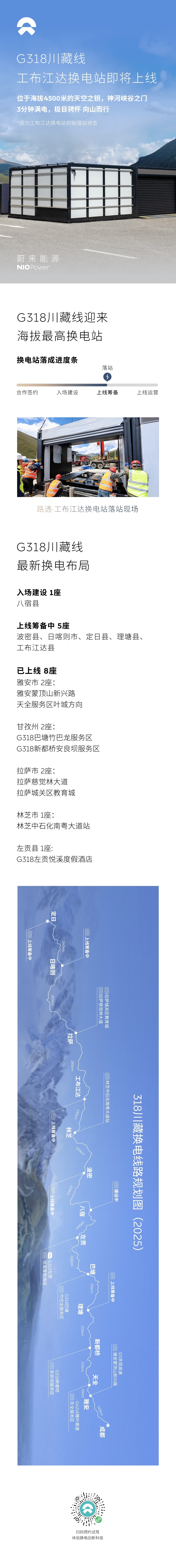 蔚来表示,后续还将继续用 14 座换电站打通 318 川藏线,让蔚来、乐道用户一路换电直达珠峰。