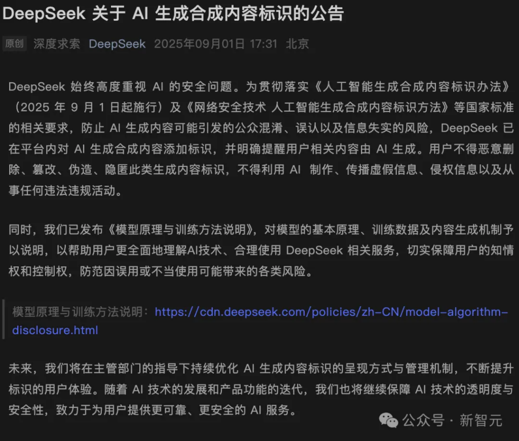 刚刚,DeepSeek官微发布了最新回应公告——凡是AI生成的内容,都会清楚标注“AI生成”。