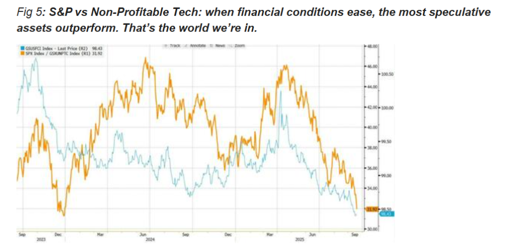 他认为,市场已经摆脱了所谓的“滚动式衰退”,正在开启一场由金融条件驱动的上涨。随着流动性阀门拧松,风险偏好会顺势下沉:从优质资产流向垃圾资产,从基本面投资转向纯粹的投机。
