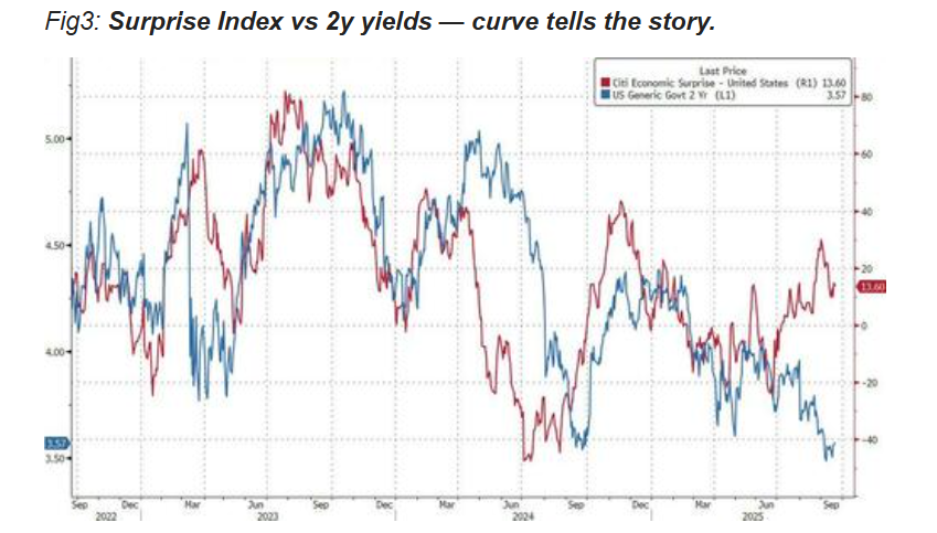 该交易员分析称,这是一个由金融环境驱动的交易。美联储在周期性上行阶段降息,叠加财政刺激,为企业回购提供了大量“弹药”。从利率市场看,前端收益率(如2年期国债收益率)对超预期的经济数据已不再敏感,这表明市场预期利率将被牢牢控制住。