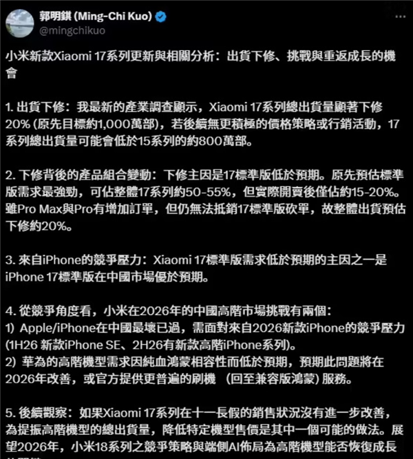 按照郭明𫓹在报告中的说法,其从产业链调查的最新消息显示,小米17系列的总出货量显著下调约20%(原定目标约为1000万台)。