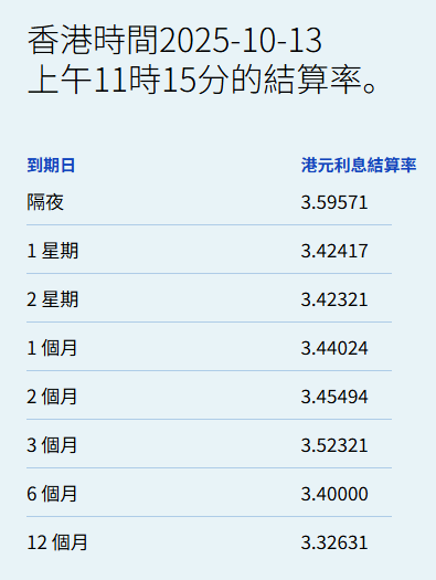 10月13日,港元拆息普遍向下,而与楼按相关的一个月拆息报3.44024%,跌4.411基点,并连跌四日;反映银行资金成本的三个月拆息报3.52321%,跌6.256基点。