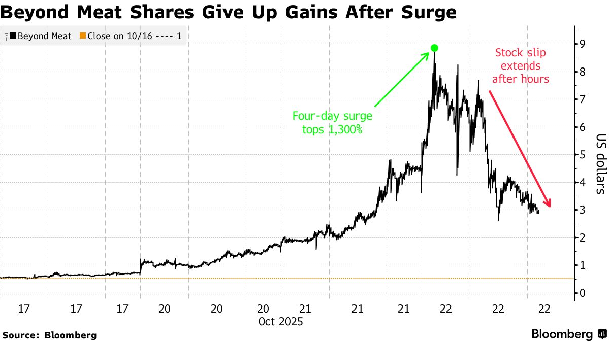 本轮飙升始于上周五,周一延续涨势。消息面上,交易员Demitri Semenikhin在社交媒体大举推荐该股,手法与新冠疫情期间Keith Gill(网名Roaring Kitty)助推游戏驿站(GME.US)股价暴涨如出一辙。周三,沃尔玛宣布将Beyond Meat产品供应范围扩大至超2000家门店,进一步推高股价。