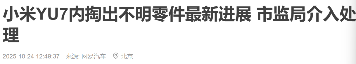 电动知家消息,近日,据多家媒体报道,小米YU7因车内出现不明零件被市监部门介入调查。