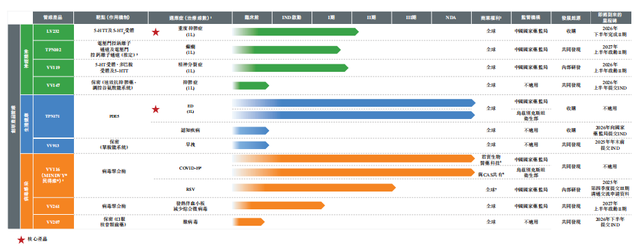 研发投入的高企反映了公司对创新管线的持续投入。招股书显示,旺山旺水已搭建九个创新资产管线,其中两项处于商业化阶段,四项处于临床阶段,三项处于临床前阶段。这种全方位的管线布局需要巨额资金支持,特别是在核心产品LV232(抗抑郁)和TPN171(治疗ED)推进临床的过程中,研发费用自然水涨船高。