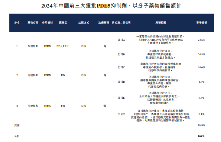 从市场份额分布来看,中国PDE5抑制剂市场呈现出明显的“三足鼎立”态势。西地那非、他达拉非和伐地那非三大药物合计占据近40%的市场份额,其中西地那非以23.6%的绝对优势领跑市场,他达拉非以10.6%位居第二,伐地那非和其他药物共同瓜分剩余份额。然而,排名前三的药物合计市场份额尚未超过40%,这意味着市场仍然存在大量的分散空间。对于TPN171这样的新产品而言,这既是一个积极的信号,也暗示着市场竞争的激烈程度。面对西地那非、他达拉非等已建立强大市场壁垒的竞争对手,TPN171需要证明的不仅是临床优势,更是商业化能力。